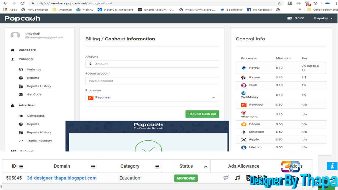Best Alternative Adsense Popcash For Blogger & Web site with Minimum Payout $10 & Get Quick Approval System.