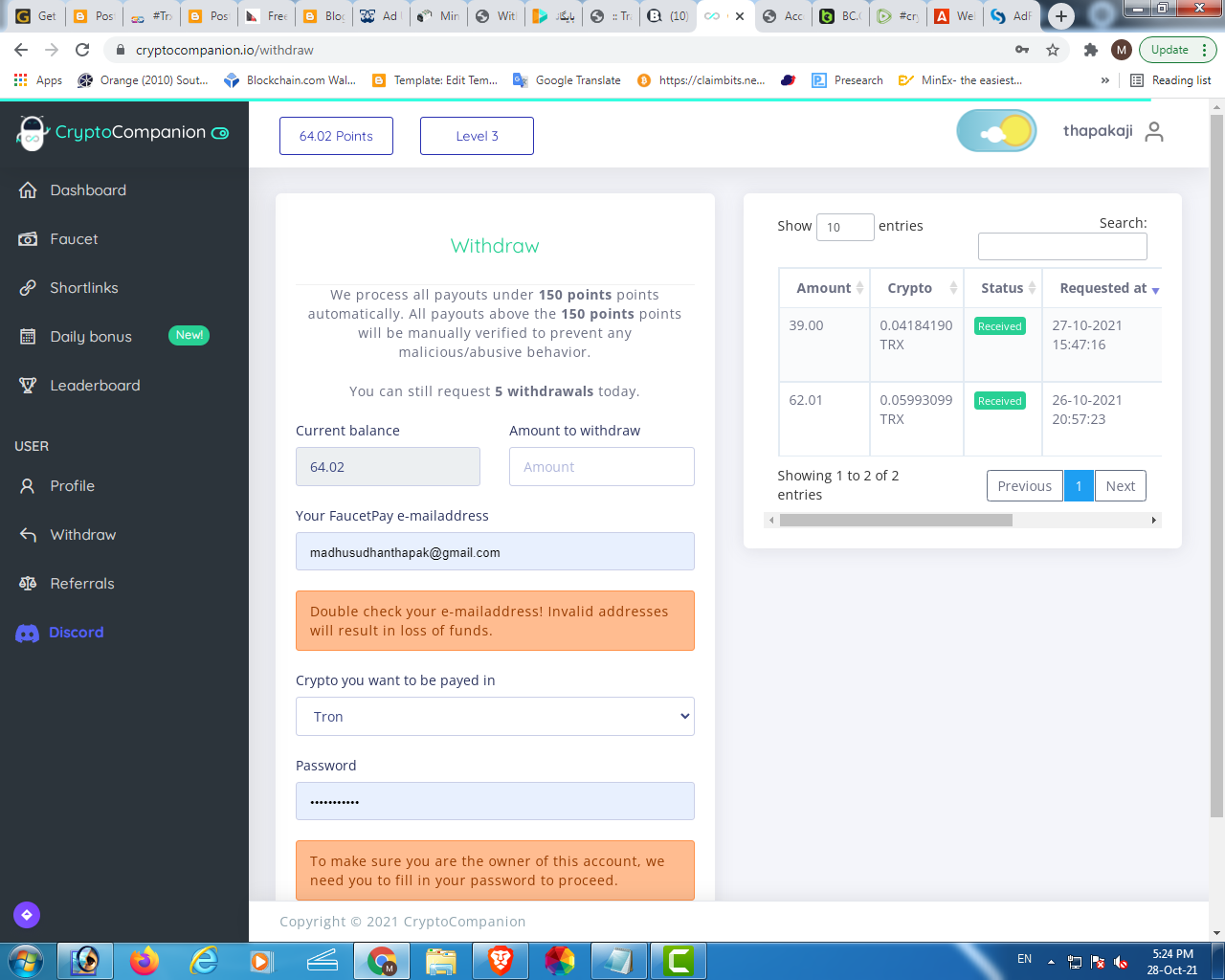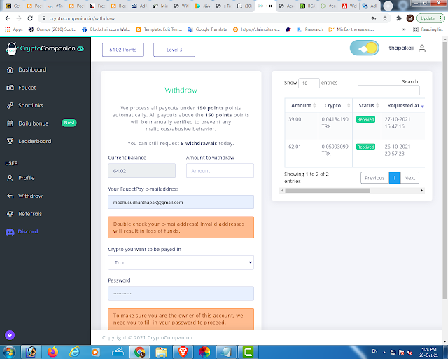 #cryptocompanion.io faucet# Per Day 5 TRX Earning#live payment proof in faucet pay#