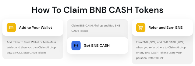 Earn BNB (30%) and BNB CASH (70%) when you refer others to Claim Airdrop or Buy BNB CASH Tokens using your personal Referral Link : https://bit.ly/3nYGmXl